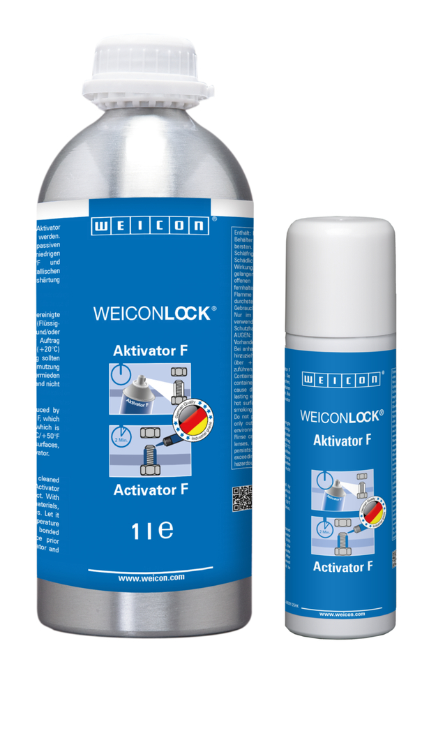 Pre-treatment with WEICON Activator F can significantly reduce the curing time. The activator is recommended for use on all passive surfaces, as well as in conditions with low ambient temperatures (+10 °C / +50 °F and below) and large bond gaps. On non-metallic surfaces, the activator is essential to enable the curing of WEICONLOCK.