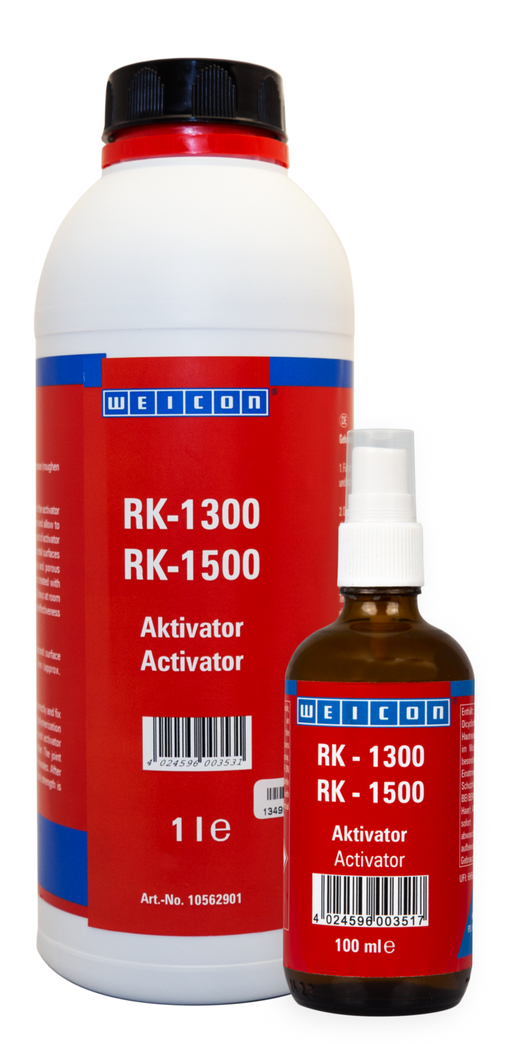 For the process-safe application of the MMA adhesives RK-1300 and RK-1500 in large containers (800 g can, 330 g cartridge, 6 kg can). The activator causes the adhesives to cure and is available in the following container sizes: 100 ml pump spray or 1 l bottle.