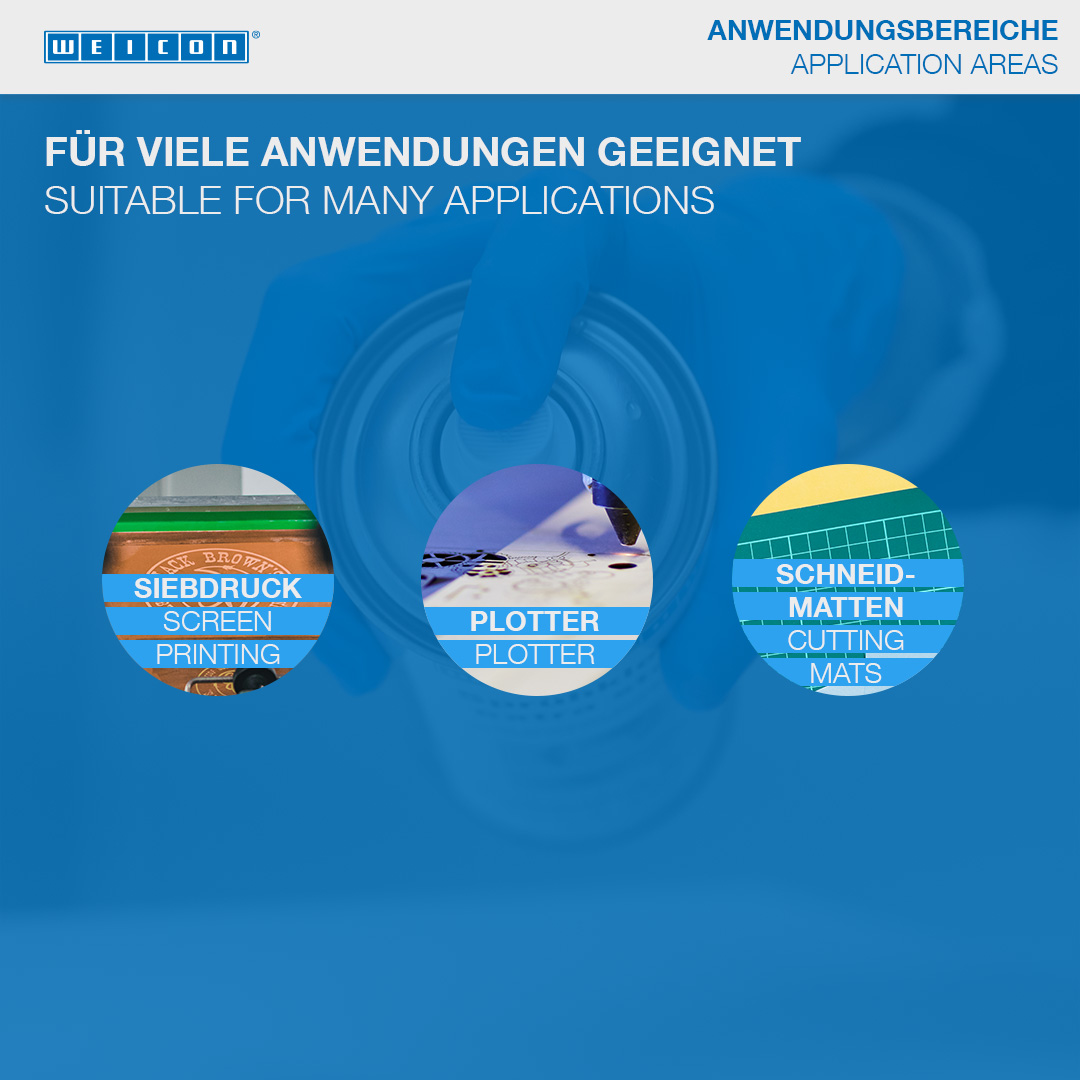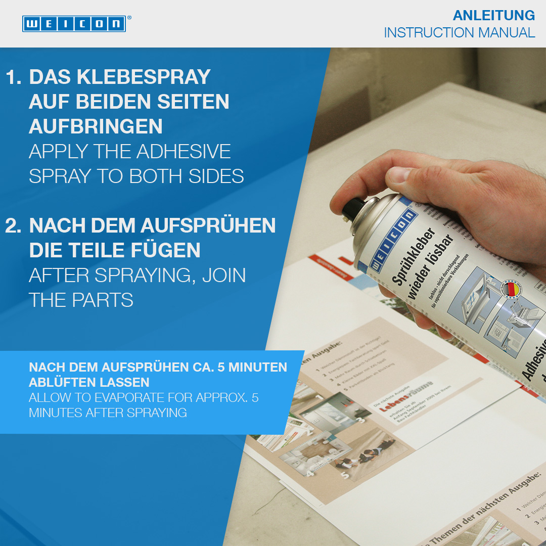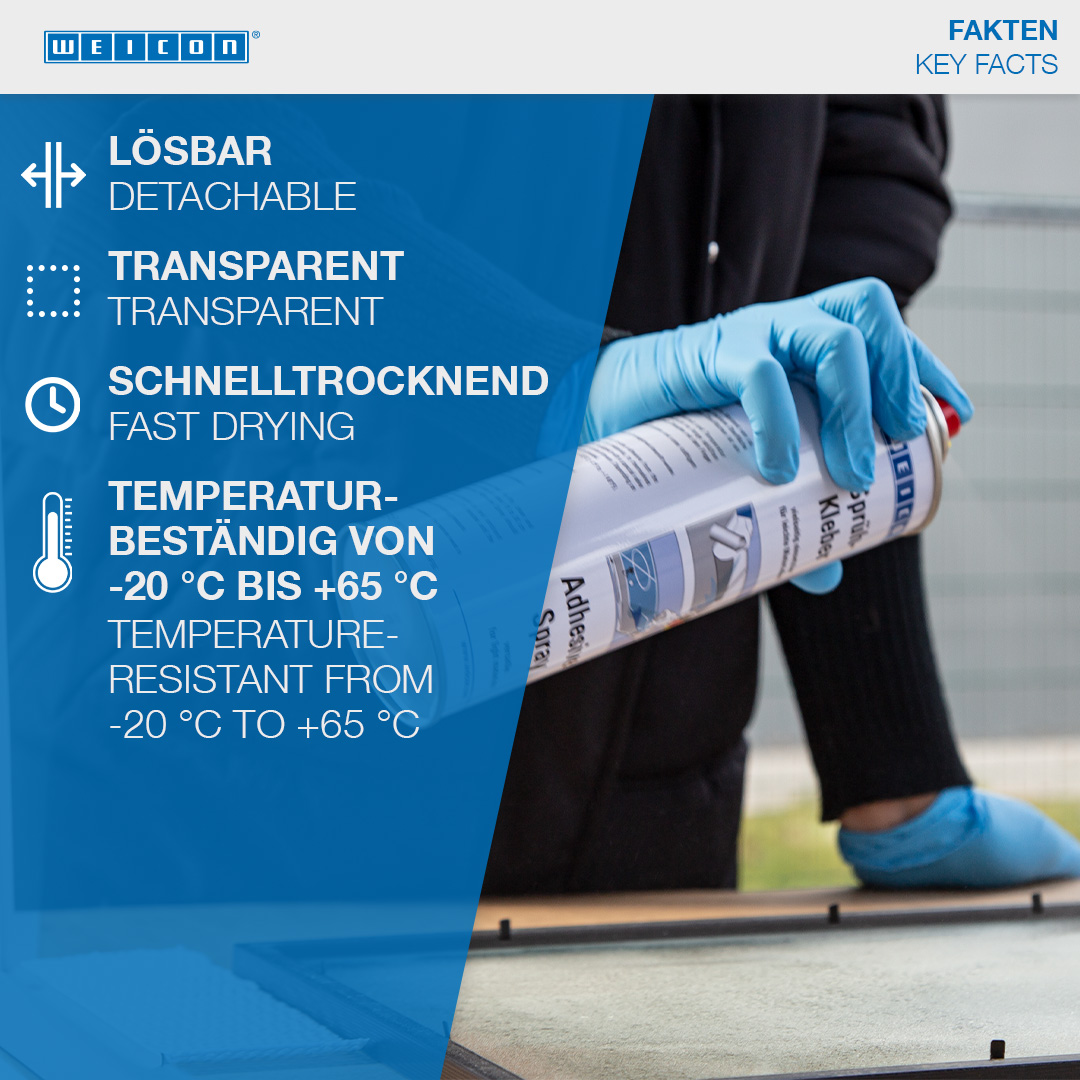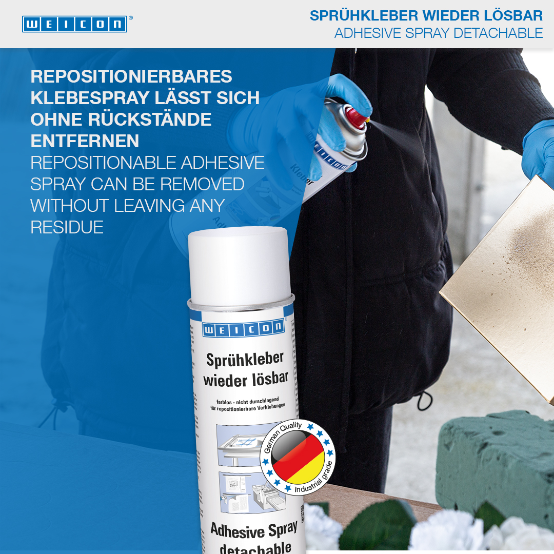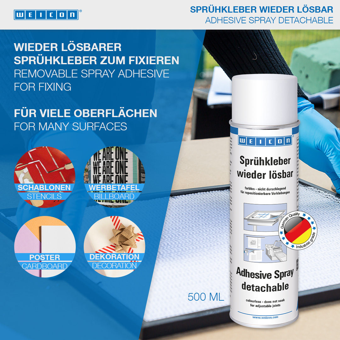 WEICON Adhesive Spray for detachable joints is especially suited for detachable and adjustable joints. WEICON Adhesive Spray for detachable joints is colourless, does not soak through or cause discolouration, and does not leave a wavy surface, even when used on thin materials. Adhesive Spray for detachable joints can be used to bond paper, cardboard and foils. The joint is detachable when the spray is applied to one side; applying the spray to both sides makes the joint permanent. WEICON Adhesive Spray for detachable joints can be used, for example, to fuse templates, billboards, posters, photos, decorations in trade show construction, layouts and technical drawings.