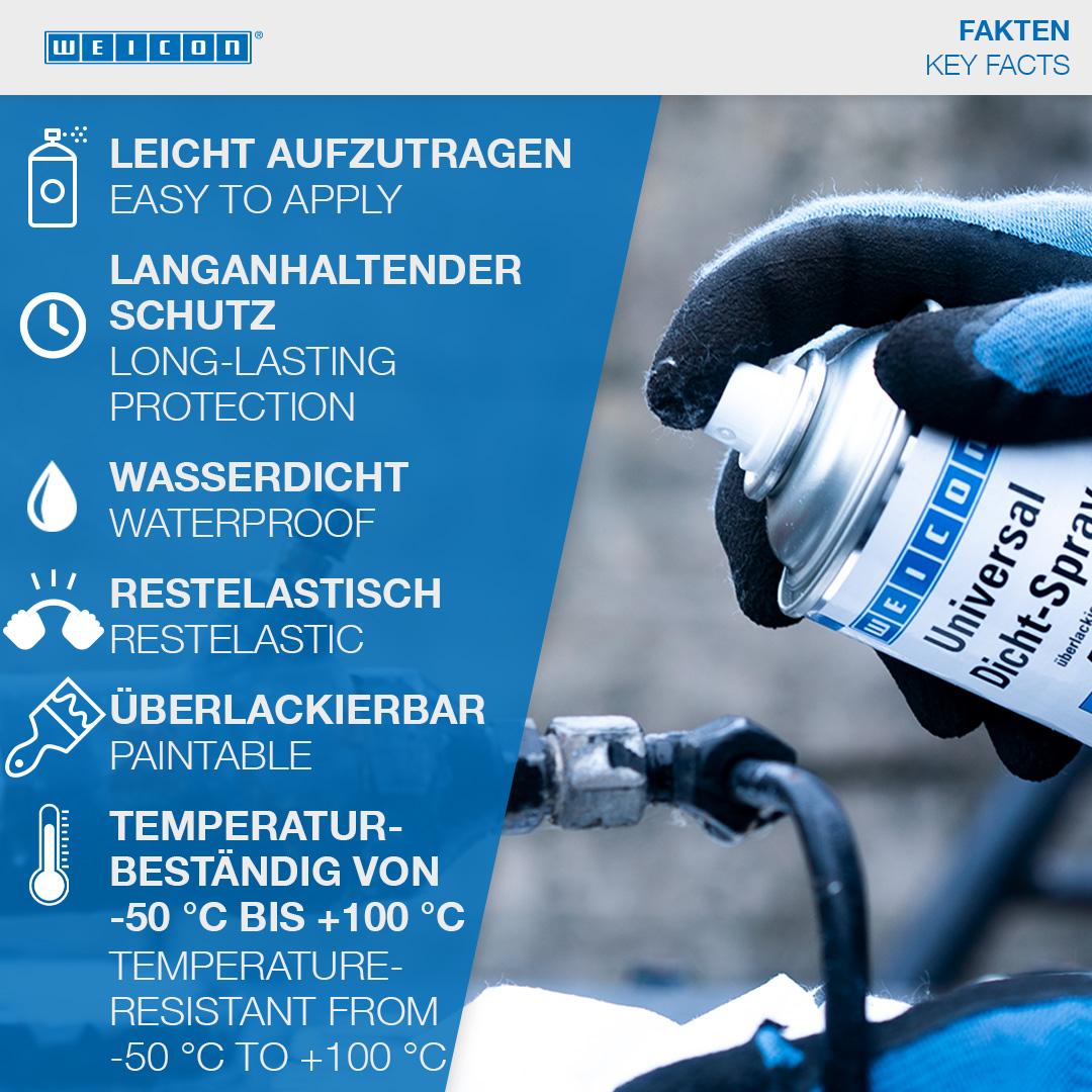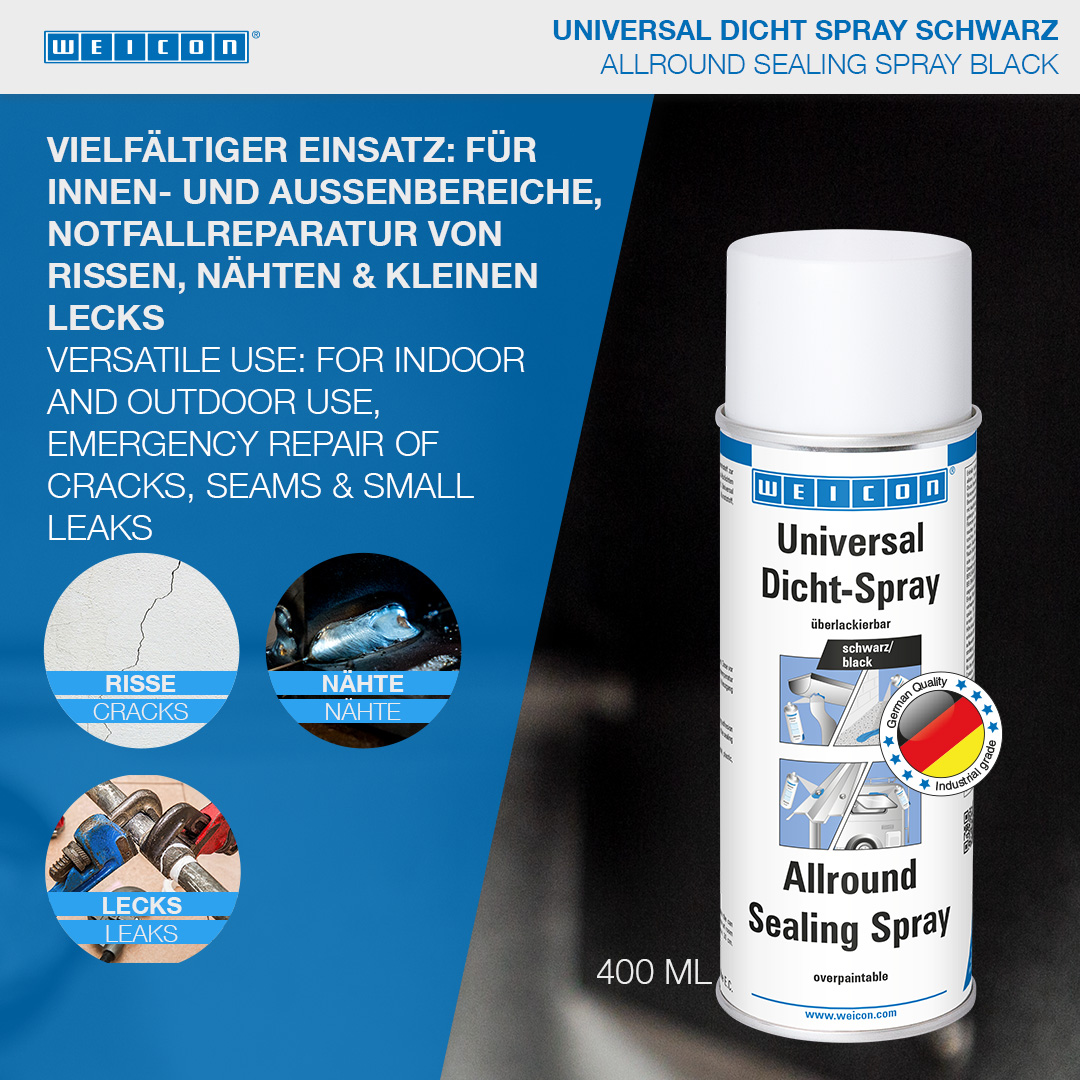 WEICON Allround Sealing Spray is a strongly adhesive, sprayable plastic for the sealing of leaks. It was developed especially for sealing thin cracks and seams indoors and outdoors. It can be used for the sealing of various components, such as gutters, sewage and drainage pipes, caravans, mobile homes, boats, roofs, windows, pool walls, pond foils, cellar shafts and ventilation shafts. Allround Sealing Spray adheres to many surfaces, like stone, metal, plastic, wood, enamel, and many more. The spray is paintable, waterproof and weather- and UV-resistant. It protects metals against corrosion and is free of bitumen and silicone.