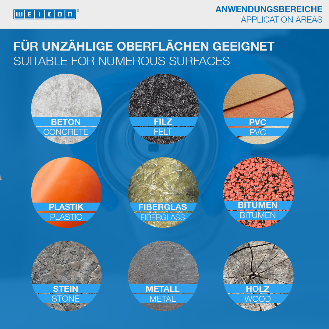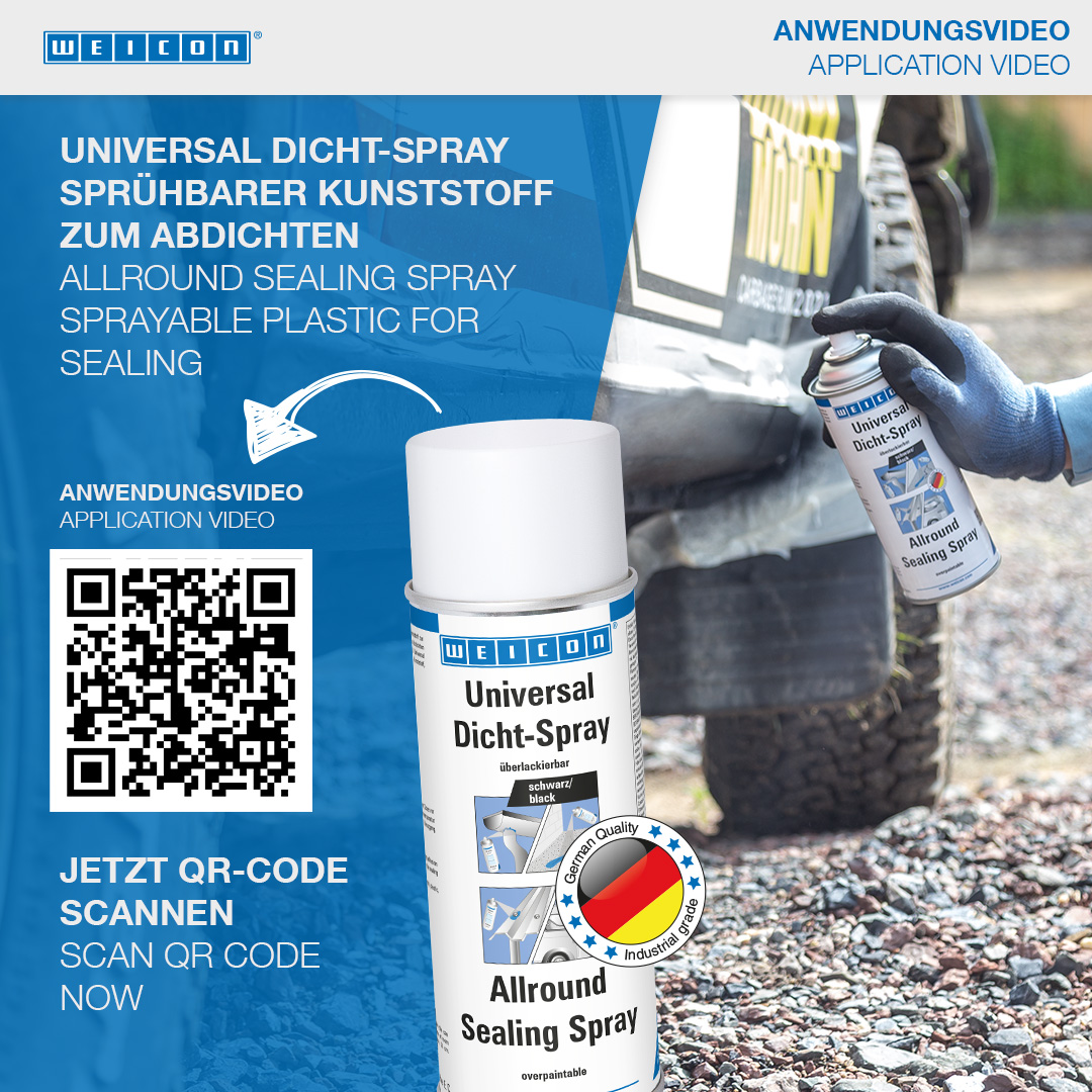 WEICON Allround Sealing Spray is a strongly adhesive, sprayable plastic for the sealing of leaks. It was developed especially for sealing thin cracks and seams indoors and outdoors. It can be used for the sealing of various components, such as gutters, sewage and drainage pipes, caravans, mobile homes, boats, roofs, windows, pool walls, pond foils, cellar shafts and ventilation shafts. Allround Sealing Spray adheres to many surfaces, like stone, metal, plastic, wood, enamel, and many more. The spray is paintable, waterproof and weather- and UV-resistant. It protects metals against corrosion and is free of bitumen and silicone.