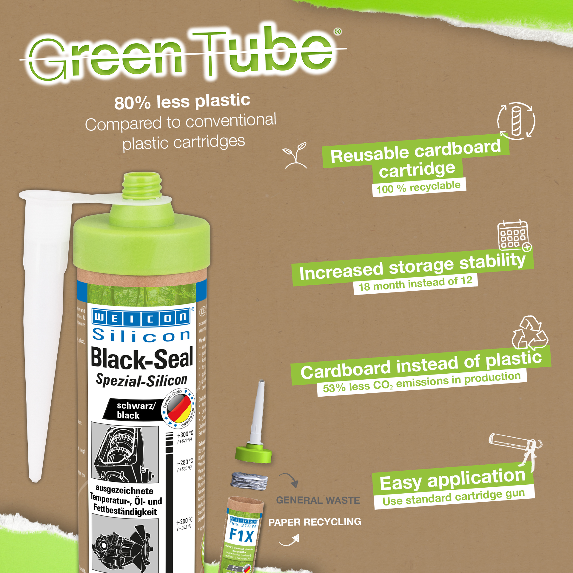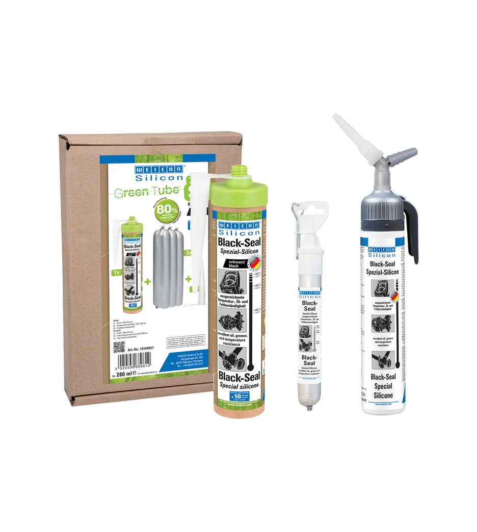 WEICON Black-Seal is black, high-temperature-resistant (+280 °C/+536 °F), free of solvents, strong, oil-resistant, grease-resistant, pressure-resistant, resistant to ageing and extremely elastic (breaking elongation of approx. 500%). It is suitable for bonding and sealing in applications where particularly high oil and grease resistance is required. The product can be used on gearbox, valve and casing covers, oil sumps, water pumps, gears and axles, flanges, tanks and containers, and in many other areas.