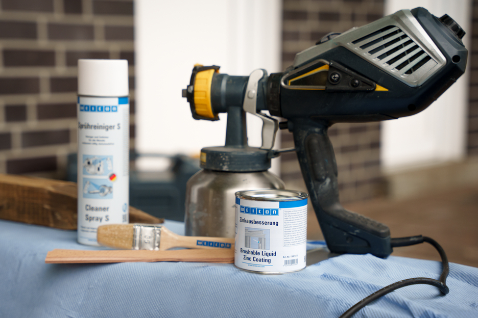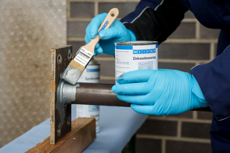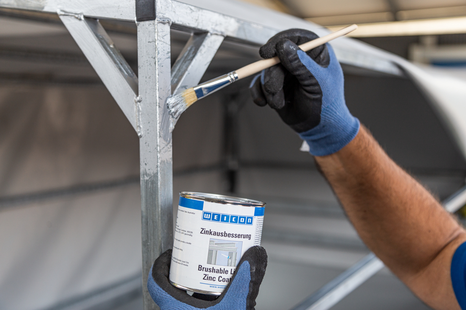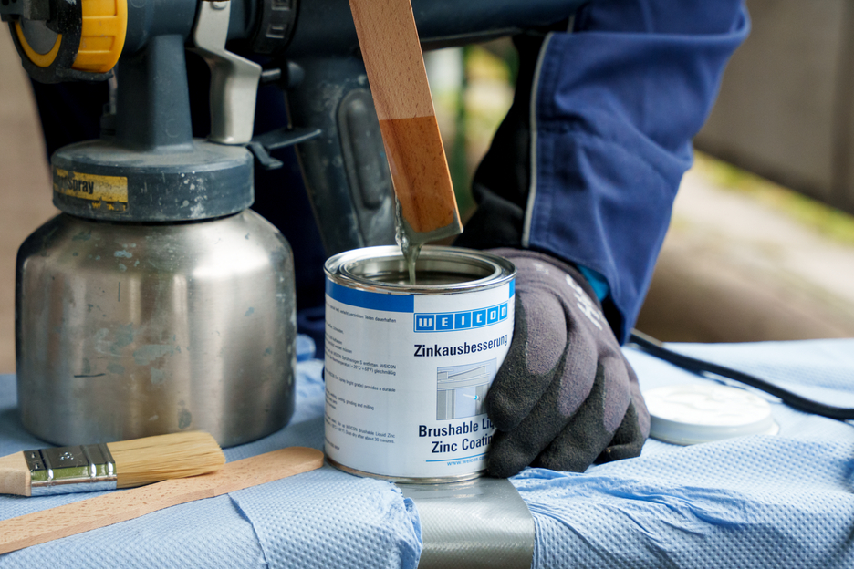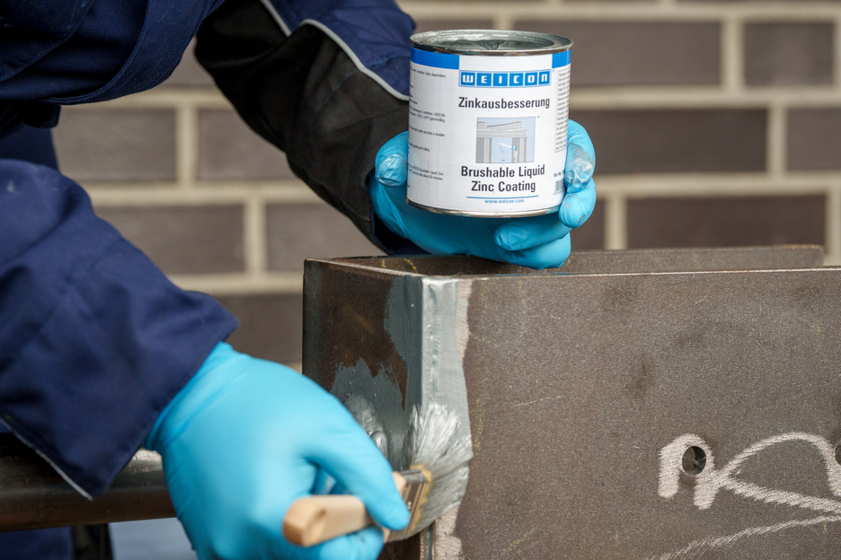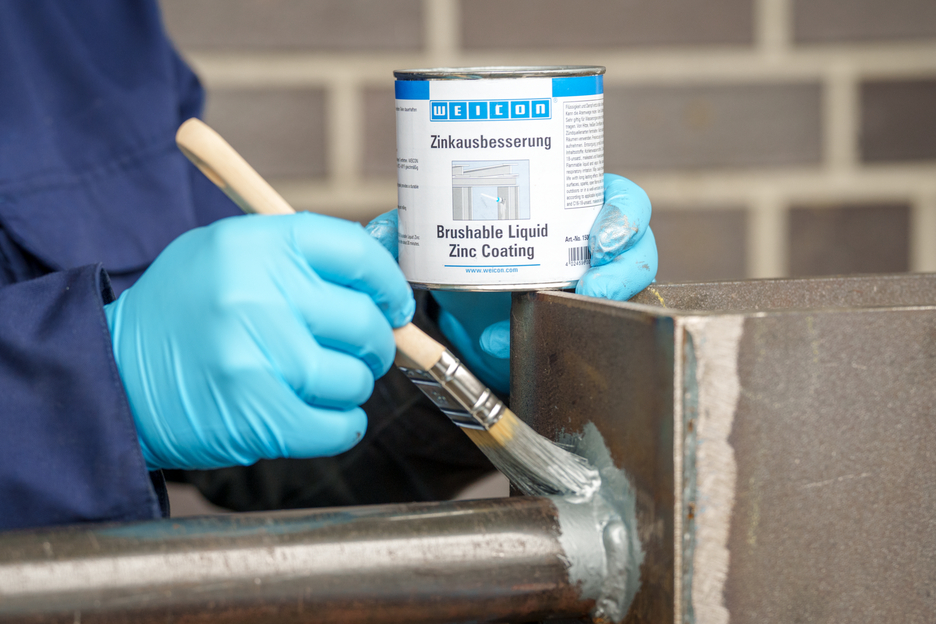 WEICON Brushable Liquid Zinc Coating provides active protection against corrosion for all metallic surfaces and is available in a colour shade matching galvanization. In the case of WEICON Brushable Liquid Zinc Coating, flaky metal pigments (flakes) settle parallel to the surface in several, spatially displaced layers on the substrate (shingle effect). That way, even when the layer thickness is low, high corrosion protection is achieved. Thus, it meets the requirements stated in the DIN EN ISO 1461 standard. This protects the surface longer from penetrating moisture. Optimal corrosion protection is achieved through the simultaneous electro-chemical effect.