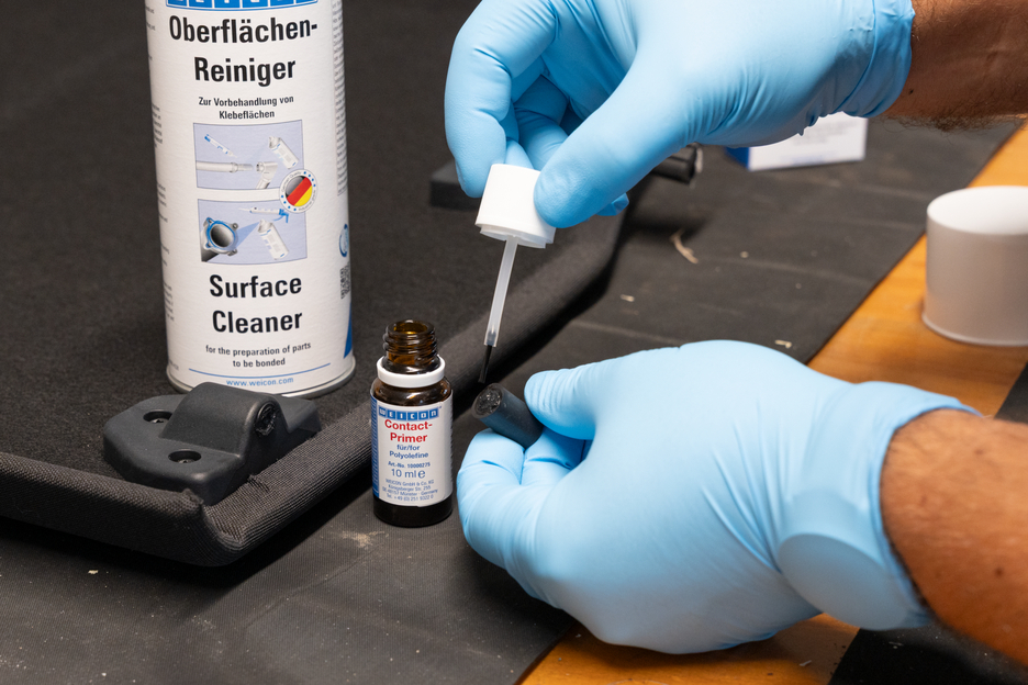 Without pre-treatment, many plastics cannot be bonded or bond only under certain conditions. When these plastics are pre-treated with WEICON Contact Primer, their surface structure changes. Thereby, the joining of materials like polyethylene (PE) and polypropylene (PP), belonging to the polyolefine group, is made possible. Even modern thermoplastic elastomers (TPE), PTFE and related plastics as well as silicones can be bonded, when pre-treated with WEICON Contact Primer.