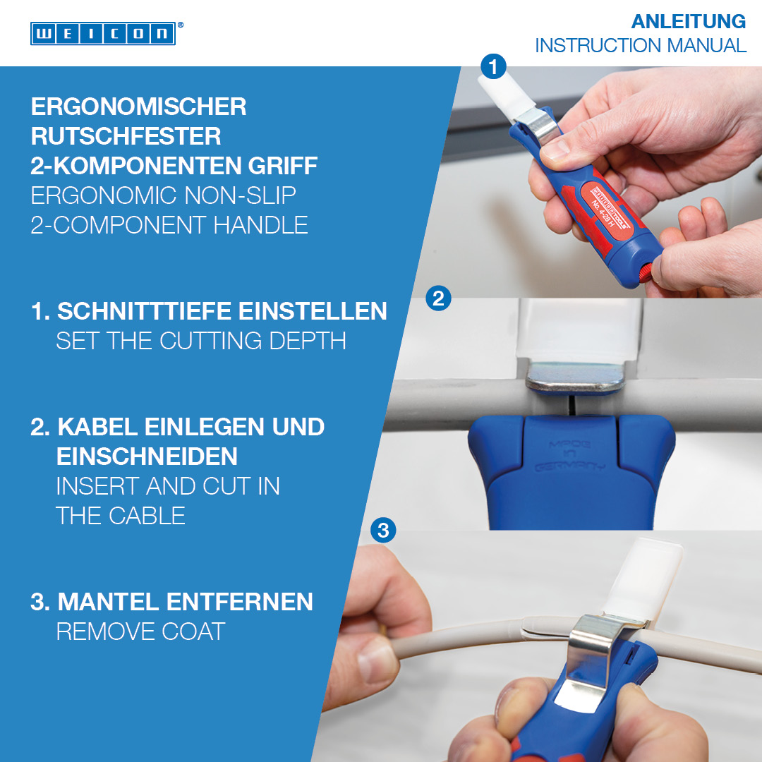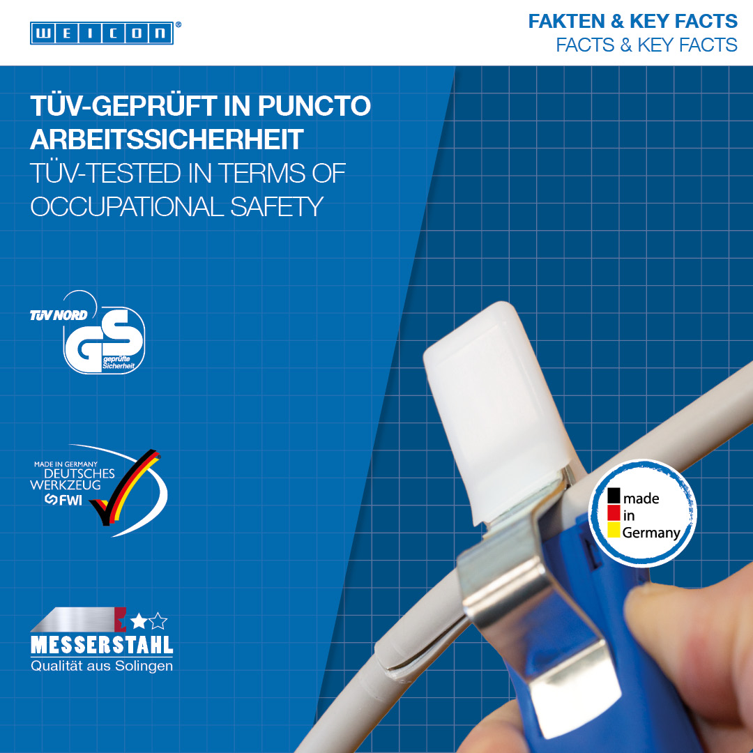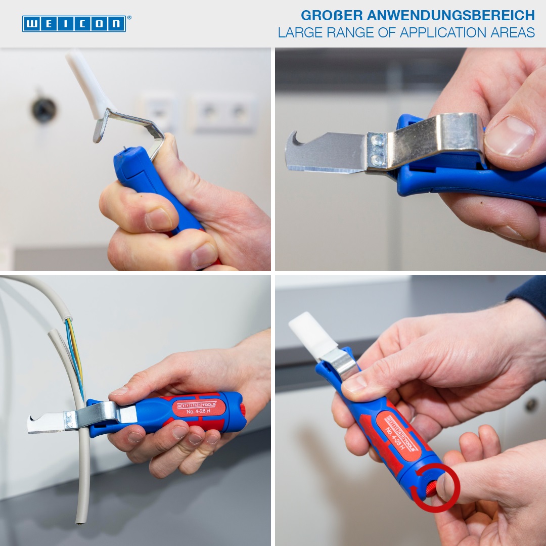 hook blade and protective cap I Infinitely variable and easy to operate adjusting wheel Self-turning I rotating inner blade I Precise, quick and safe stripping I Working range 4 - 28 mm Ø I multi-component handle with ergonomic shape
