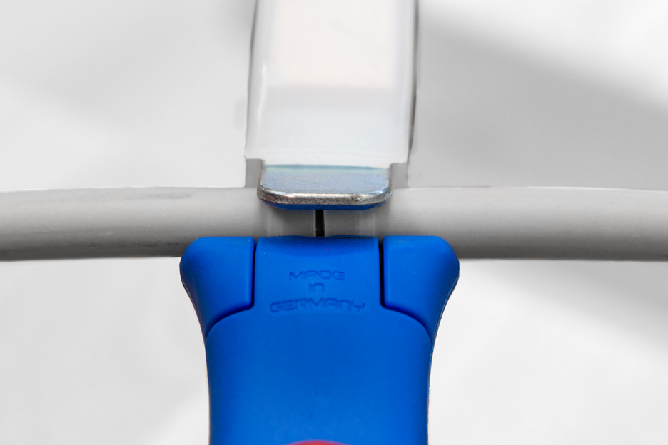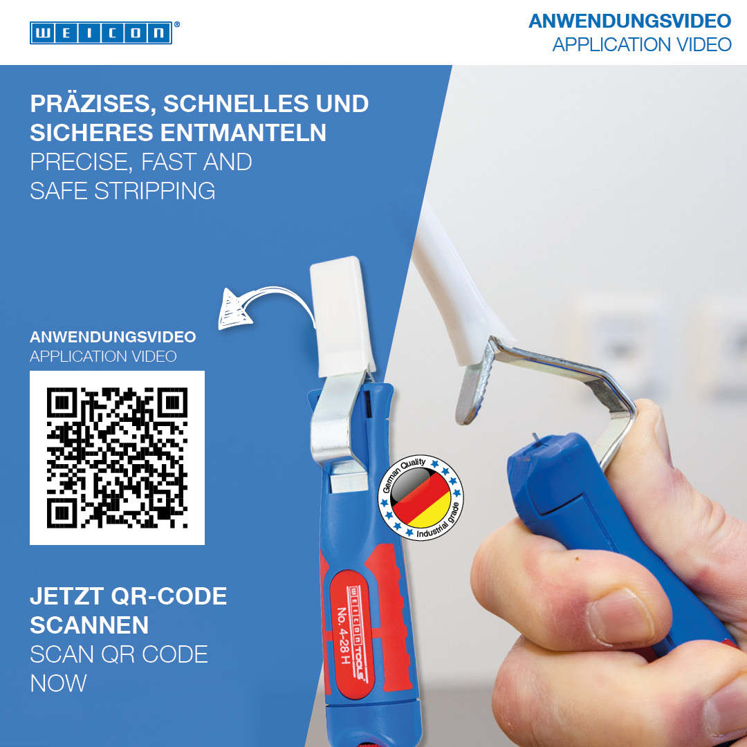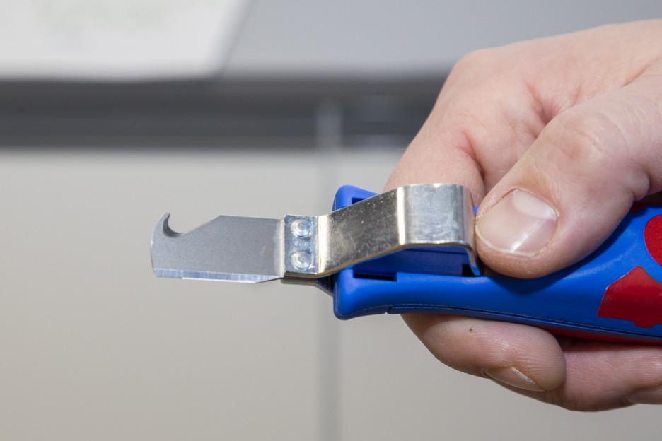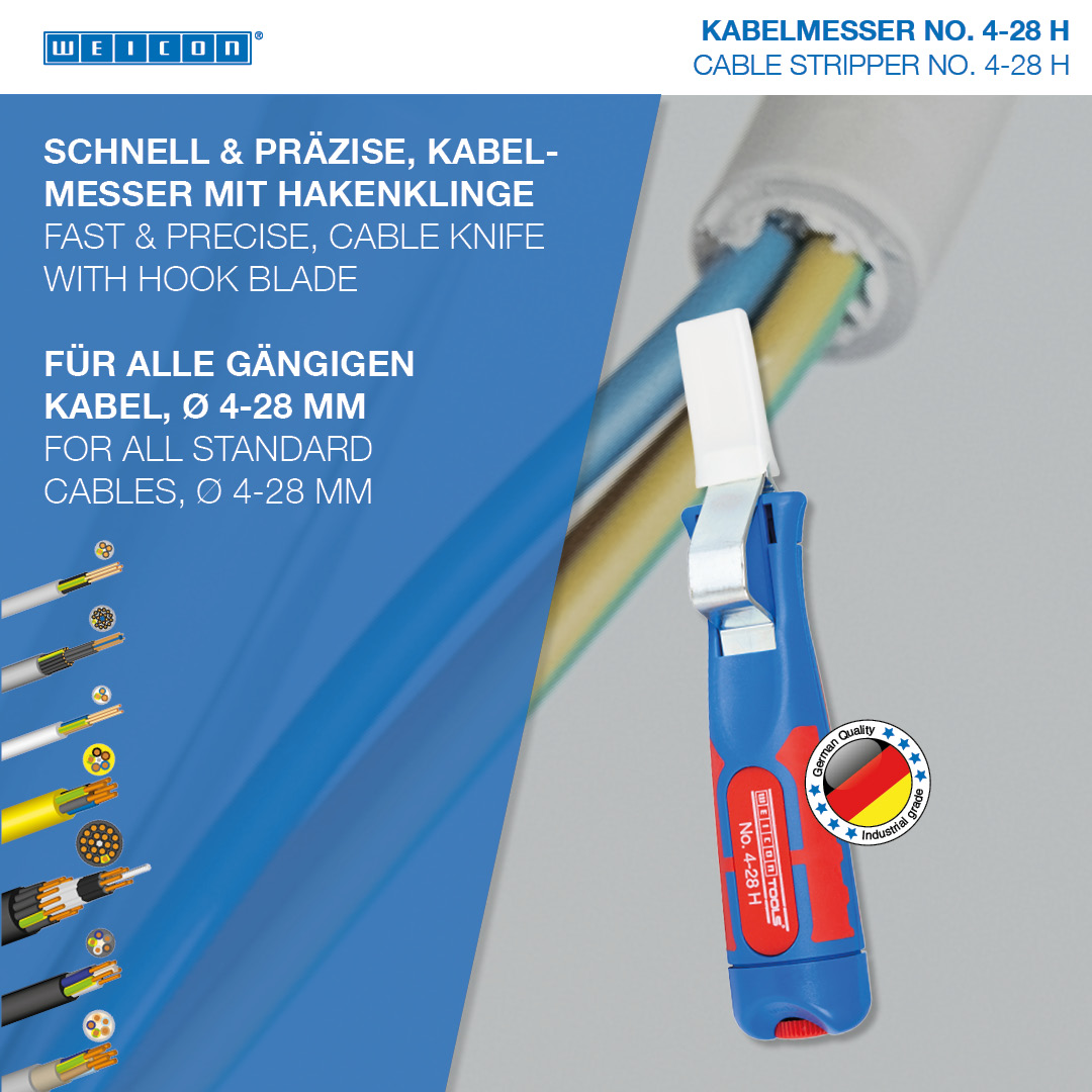 The Cable Stripper 4-28 H enables precise, fast and safe stripping of all common round cables with a diameter between 4 and 28 millimetres. The Cable Stripper has a non-slip, multi-component handle with ergonomic shape. Thanks to the set screw on the back of the handle, the cutting depth can be adjusted with an infinitely variable range. This prevents damaging the inner conductor. The cutting blade is integrated in the housing and self-rotating, thus enabling the automatic adjustment from circular to longitudinal cutting. In addition, the 4-28 H has a hook blade, which can be covered with a safety cap. The cap locks the blade safely, which significantly reduces the risk of injury.