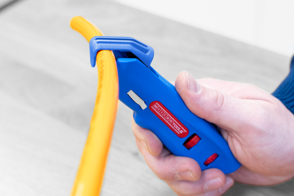 Circular, longitudinal and spiral cuts for soft and hard cable insulations I For all common round cables with a diameter of 4 to 28 mm I With an integrated self-retracting safety blade that automatically retracts in case of misuse to prevent cutting injuries I Blade depth comfortably adjustable from 0-3 mm thanks to lockable adjusting screw (in steps of 0.1 mm) I Cutting depth 0-3 mm