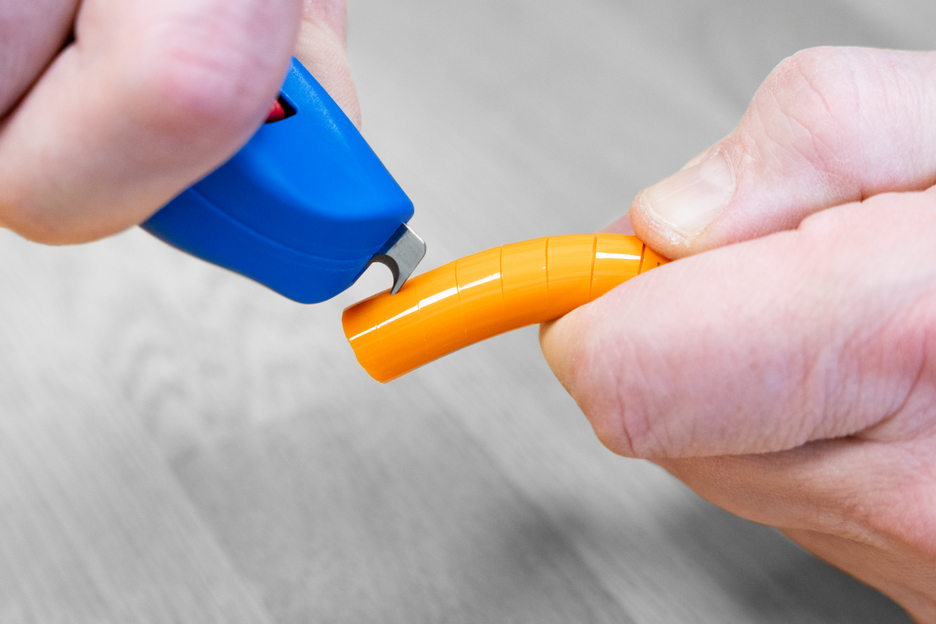 The Cable Stripper No. S 4-28 Spiral is perfect for the precise, fast and safe stripping of all common round cables with a diameter between 4 and 28 millimetres. For cables that cannot be easily stripped using circular and longitudinal cuts, the tool has an additional feature – a spiral cut, which makes it possible to easily remove complex insulation. The rotatable inner blade can be used for circular, longitudinal and spiral cuts on both soft and hard cable insulation. The cutting depth can be comfortably and precisely adjusted in 0.1 mm increments from 0-3 millimetres using a lockable adjusting screw, which prevents damage to deeper layers. The cutting blade is self-rotating and integrated into the housing, allowing for quick automatic switching between circular and longitudinal cuts – only when using the spiral cut, the blade needs to be locked in place. To perform a spiral cut, the function is switched from circular to spiral cut using a setting wheel. Then, by flipping the spiral switch, the internal blade is locked in place, and the cable stripper is ready to make the spiral cut. To switch back to the circular cut, the lock must be released using the spiral switch. The blade will then move freely again, allowing you to carry out the circular cut as usual. After performing the spiral cut, it is advisable to make a small incision at the end of the insulation. It is then easier to peel it off. The tool is equipped with a retractable hook blade for this purpose. The self-retracting safety blade is operated via a slider and automatically retracts in the event of misuse to prevent cutting injuries. This makes the use of the blade much safer compared to fixed blades, such as those in cutter knives.