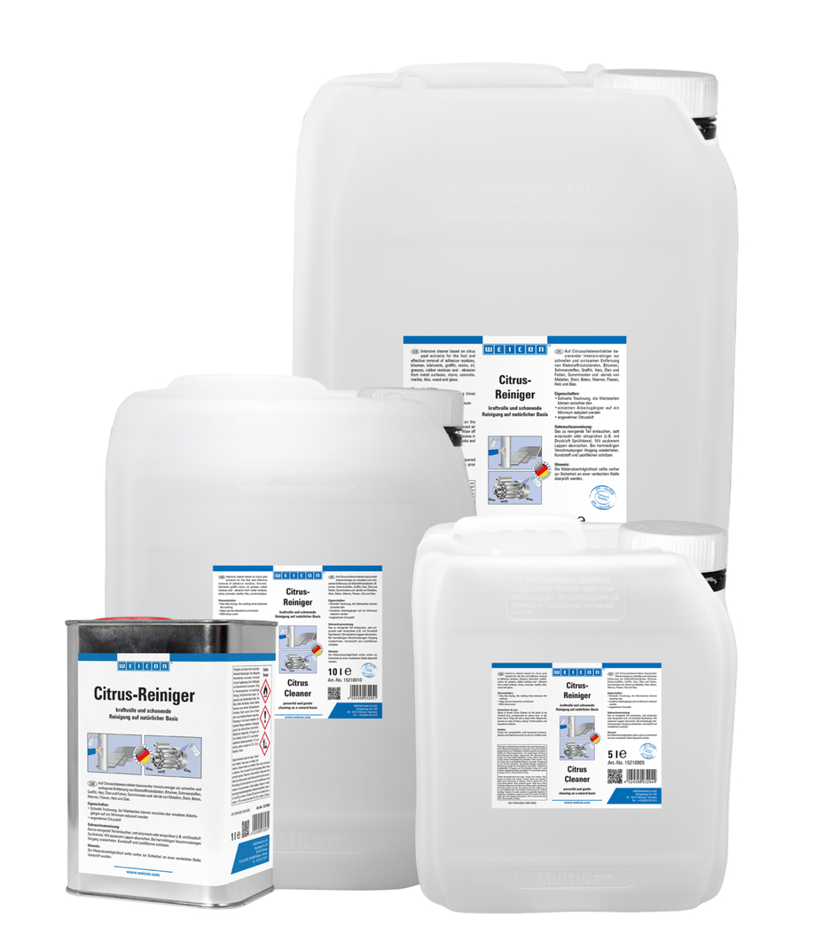 WEICON Citrus Cleaner is an all-purpose cleaner based on alcohol and citrus peel extracts. Thanks to its high isopropanol content of over 75%, WEICON Citrus Cleaner makes use of its disinfectant effect and thus supports the overall cleaning and disinfection of surfaces. It is suitable for all-purpose use and can be used in industry and skilled trades, in window construction, in public facilities and public transport, in construction companies, and around the house. It cleans a wide variety of materials, such as metals and plastics, glass, ceramic as well as painted and coated surfaces*. WEICON Citrus Cleaner also achieves a high level of effectiveness and reaches high efficiency in basic hygiene and the support of additional hygiene measures, the cleaning of frequently used hand tools, soiling caused by pencils, ballpoint pens and felt-tip pens. *For safety reasons, the material compatibility should first be checked on a non-visible area.