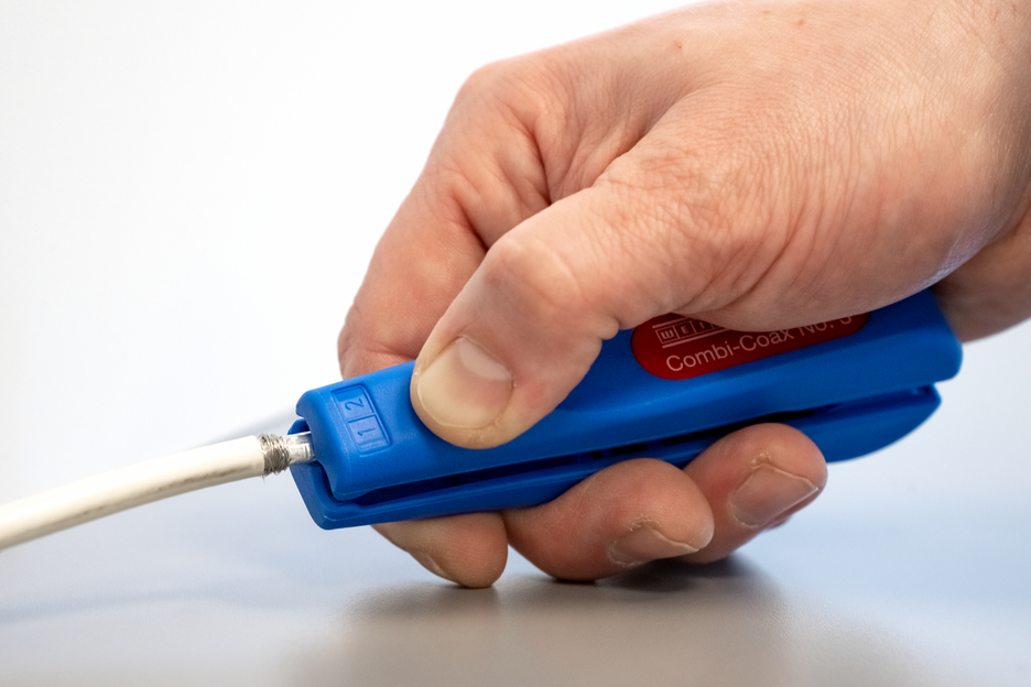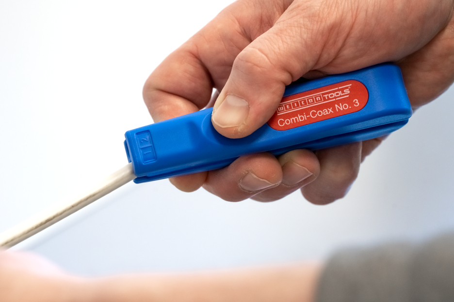 The Combi-Coax No. 3 enables step-by-step stripping of all common coaxial cables, NYM cables and flexible cables. Adjusting the cutting depth manually is not necessary. The Combi-Coax No. 3 strips coaxial cables with a diameter of 4.8 - 7.5 mm, NYM cables of 3 x 0.75 mm² and flexible cables of 10 and 16 mm². In addition, the Combi-Coax No. 3 has an easily accessible side cutter for cables up to 8 mm in diameter. When using the stripper, a precise cutting pattern is shown during stripping. For example, the first sheath of a coaxial cable can be removed with the knife of the stripper on side A. Then the inner conductor is stripped with side B.