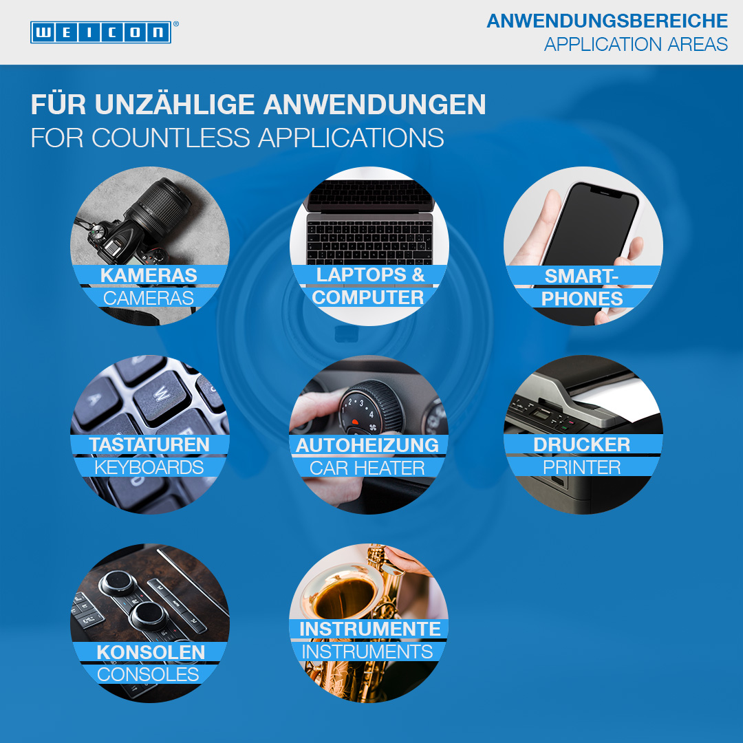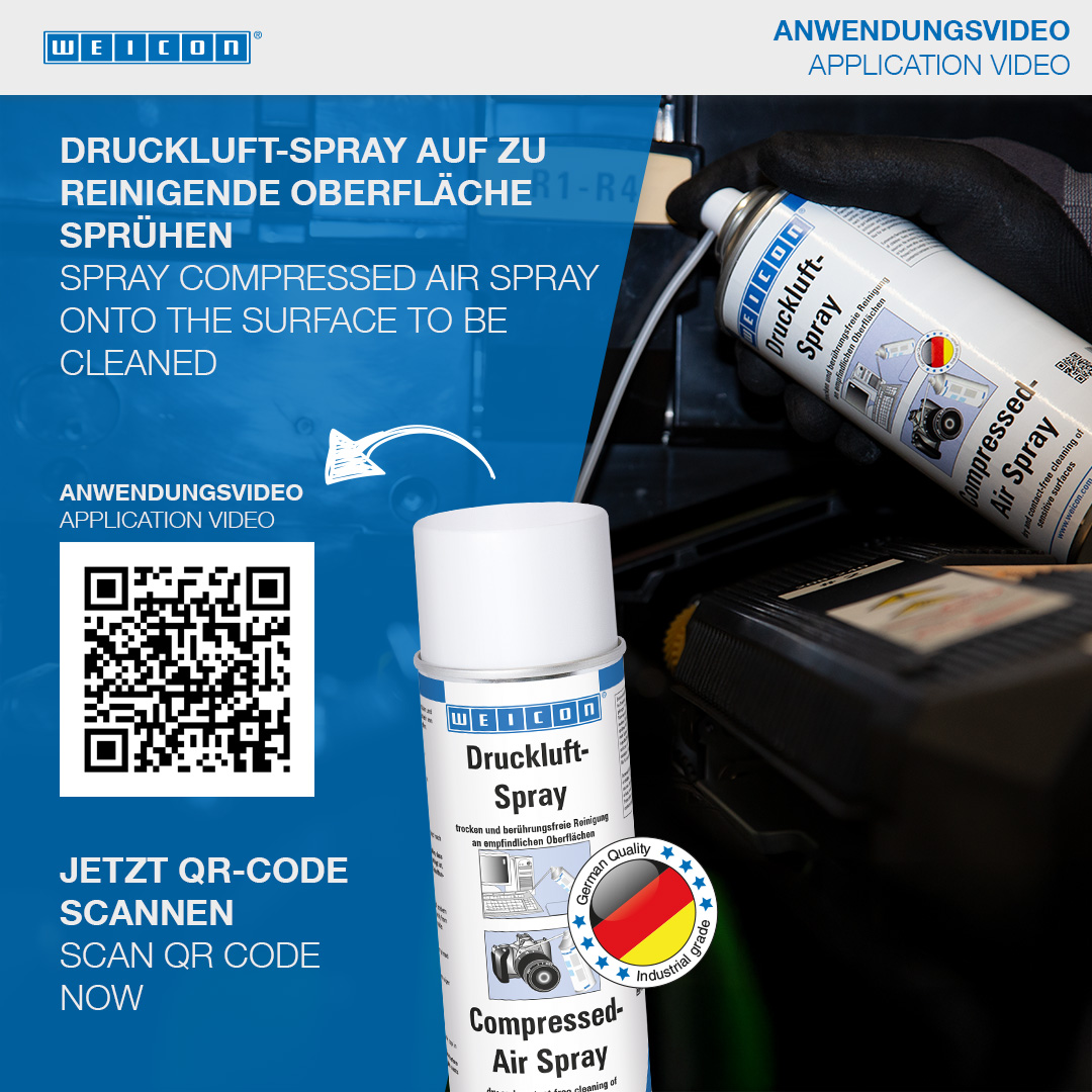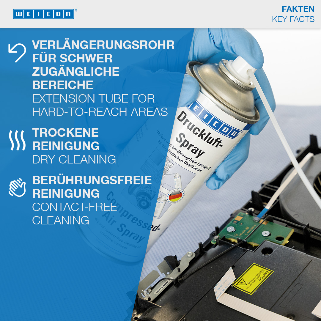 WEICON Compressed-Air Spray can be used wherever dust cannot be easily removed by conventional methods and on parts which are difficult to reach. It allows dry and contact-free cleaning of inaccessible corners and sensitive surfaces. Compressed-Air Spray can be used on HiFi and video devices (e.g. modules, circuit boards, magnetic heads, hard drives etc.), in optics (e.g. on cameras, objectives, lenses), on car fuse boxes and wiper units, on clockworks (quartz clocks), in medical technology, model making, measurement technology, on electronic components and circuit boards.