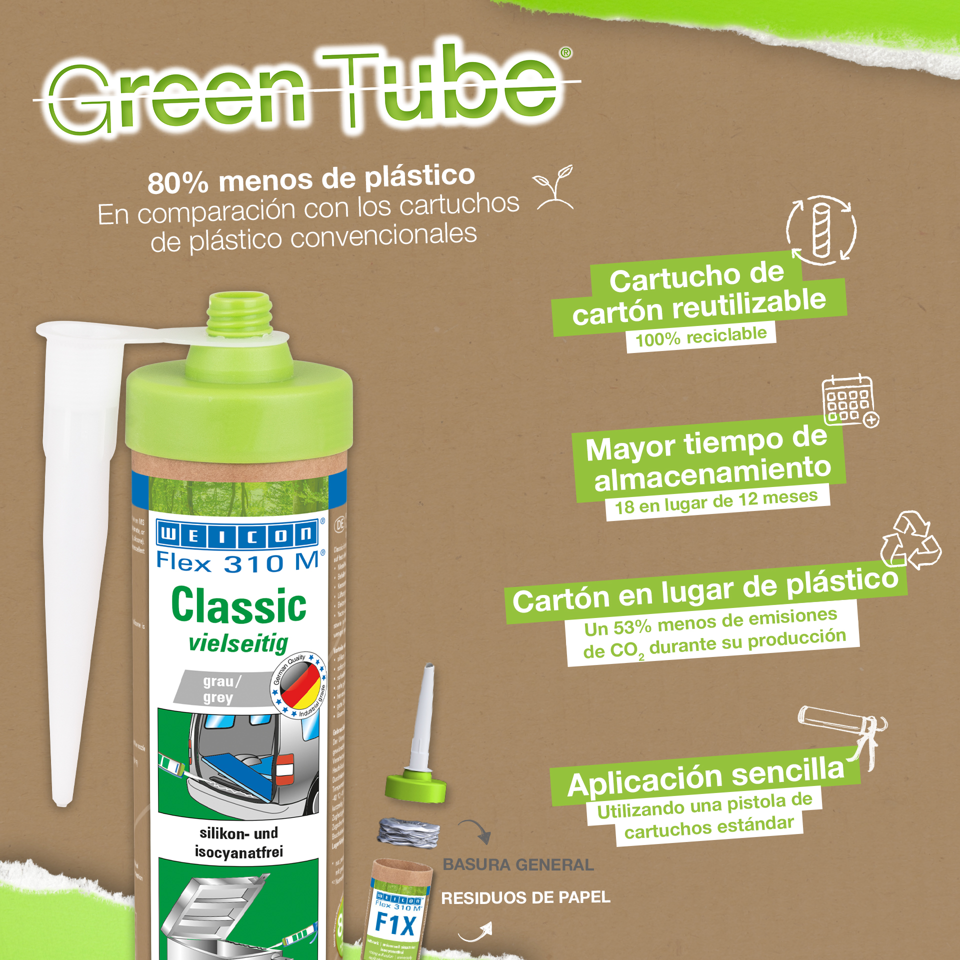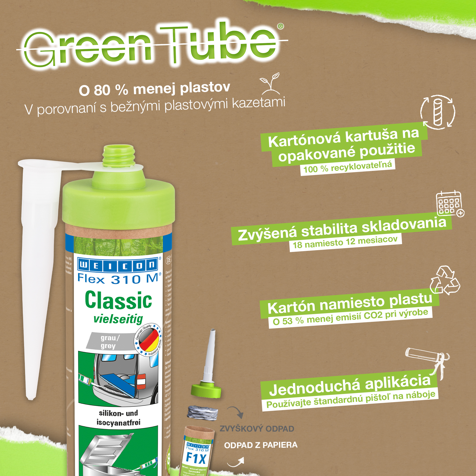 WEICON Flex 310 M Classic is strong, paintable (wet-on-wet), sandable, has an outstanding resistance to ageing and good resistance to UV rays. It is resistant to fresh and salt water and is free of silicone, isocyanate, halogens and solvents. The product as an ISEGA certificate and can be used as an adhesive in the food technology. Flex 310 M Classic is an elastic adhesive based on MS polymer and is suitable for the bonding of metals, many plastics, ceramics, wood, glass and stone. This adhesive and sealant can be used in metal construction, tank and apparatus engineering, carriage, vehicle and container construction, ventilation and air conditioning systems, in the electrical industry, yacht and boat construction, and in all applications where silicones or products containing silicones are not suitable.