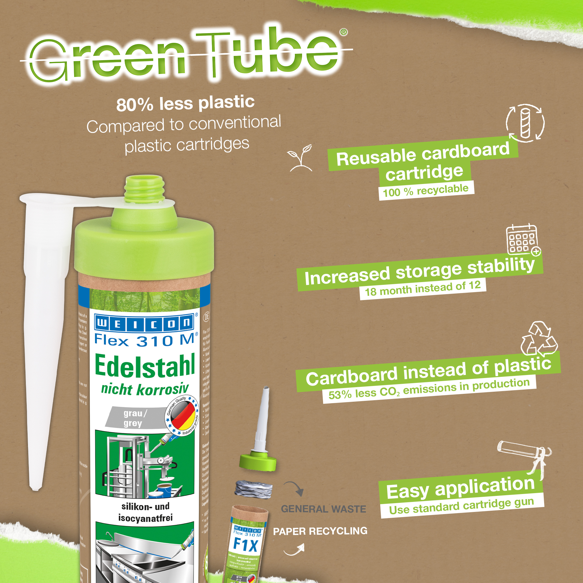 WEICON Flex 310 M Stainless-Steel Adhesive and Sealant is non-corrosive, strong, paintable (wet in wet), sandable, resistant to ageing and UV radiation and is free of silicone, isocyanate, halogens or solvents. The product as an ISEGA certificate and can be used as an adhesive in the food technology. Flex 310 M Stainless Steel is an elastic adhesive based on MS polymer and is suitable for bondings as well as seam and joint sealing on metals, such as stainless steel, aluminium and non-ferrous metals. It can also be used in all application areas where the colour of the adhesive and sealant must match the surface material (e. g. stainless steel, aluminium, etc.). WEICON Flex 310 M Stainless-Steel can be used in metal construction, tank and apparatus engineering, in the food industry, in kitchen and sanitary installations, ventilation and air conditioning systems, and in all applications where silicones or products containing silicones are not suitable.