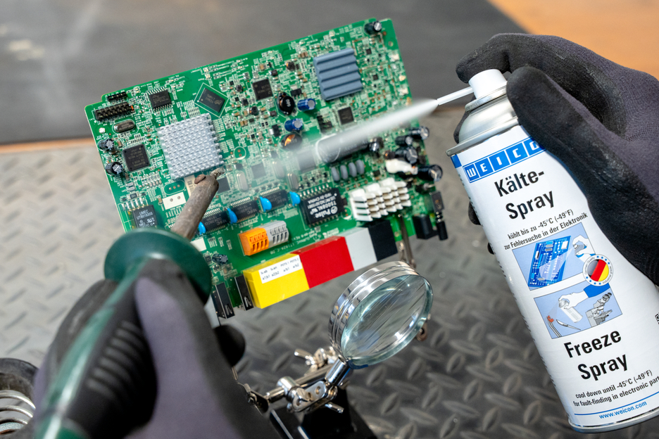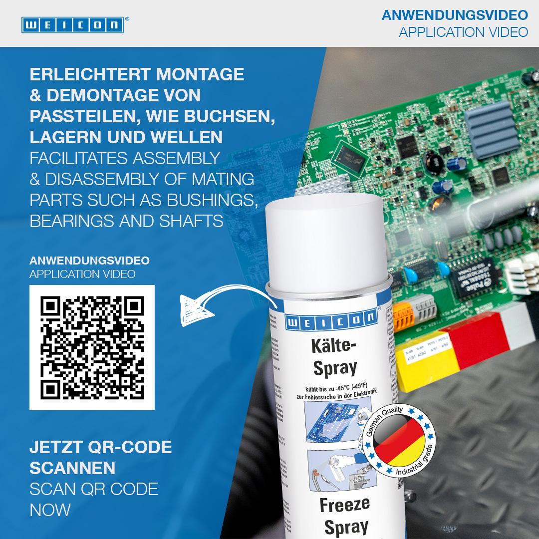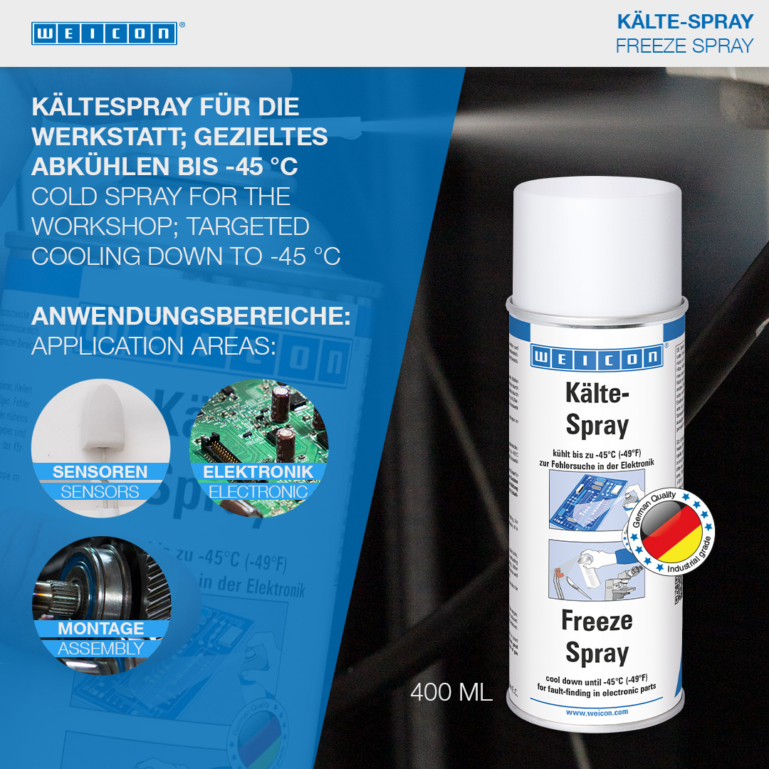 WEICON Freeze Spray has many uses and is suitable for fault-finding in electronics and for repair works in the industrial sector. Freeze Spray quickly cools parts down to -45 °C and allows pinpointed chilling of even the smallest construction parts. WEICON Freeze Spray is non-conductive and neutral to materials (with the exception of plastic) and can be used in many industrial and technical applications.