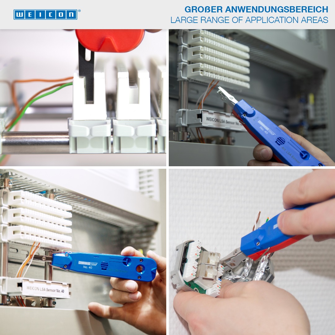 For the solderless, screwless and no-stripping inserting and simultaneously cutting of wire ends into LSA punch-down blocks I with retractable hook and unlocking blade for conductor diameters 0.35 - 0.9 mm and wire diameters 0.7 - 2.6 mm features a sensor for scanning the wire end position