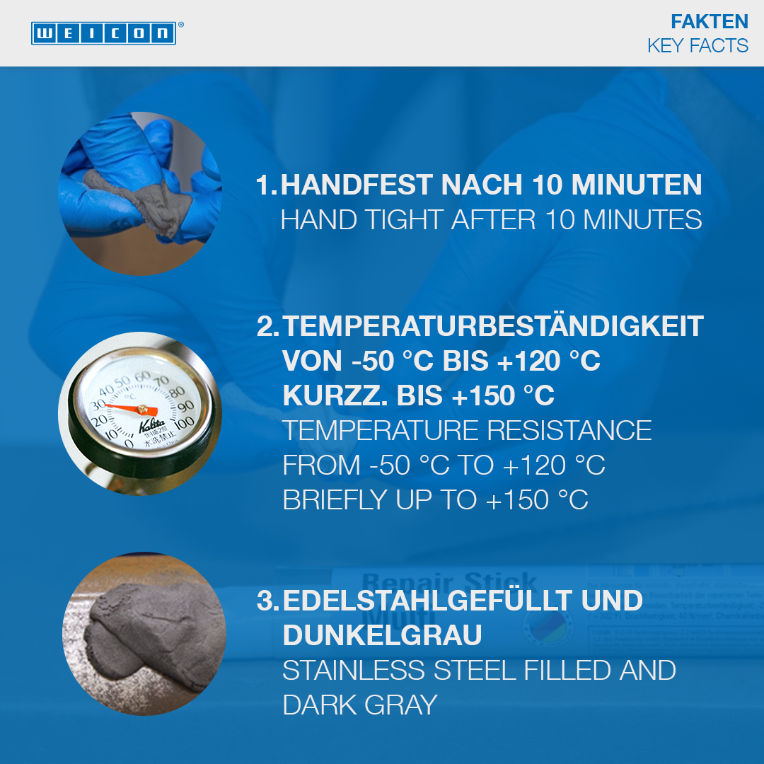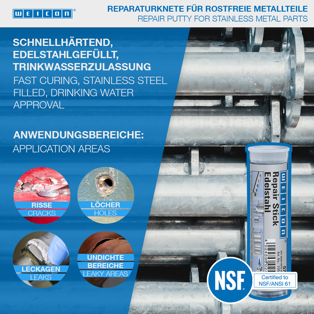 For the non-corrosive repair and reconditioning of stainless steel and other rustproof metals, such as used in tanks and containers, filling and packing machines, pipes, pipelines, pumps and housings. Due to the quick mechanical loading capacity of the mended parts (approx. 60 minutes), expensive and longer downtimes are avoided. The WEICON Repair Stick Stainless Steel can be used in tank construction and apparatus engineering, in the foods, cosmetic and pharmaceutical industries and in many other areas. Due to its special formula and the resulting NSF registration, the Repair Stick can contribute towards improvements in occupational safety and health protection.