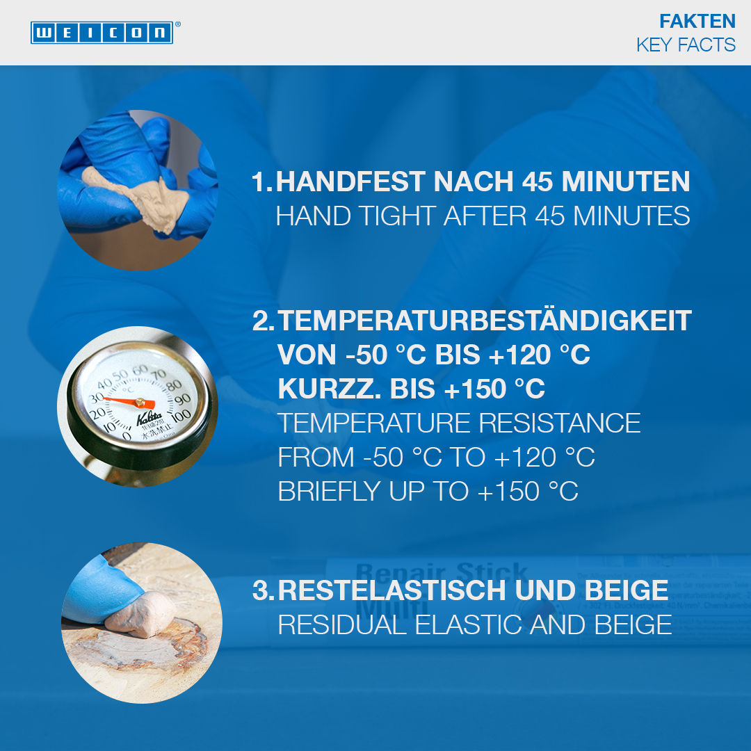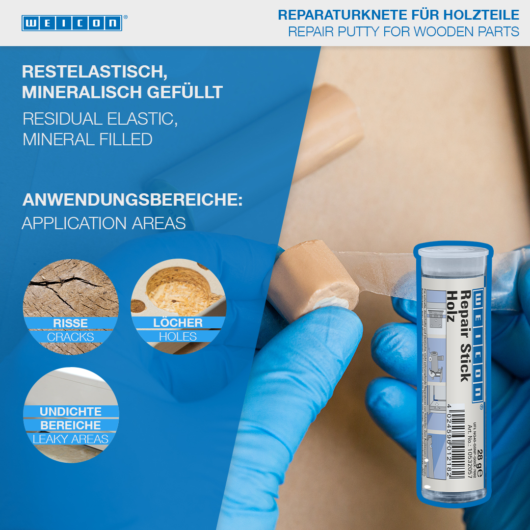 For long-lasting repairs of wooden parts. It remains elastic permanently and does not shrink. Used for the repair of cracks, drill holes, broken or chipped wood pieces, and for sealing joints in window and door frames, veneers, boards, planks, model constructions and wooden toys. WEICON Repair Stick Wood can be used in the wood and furniture industry, in model building and in many other areas.