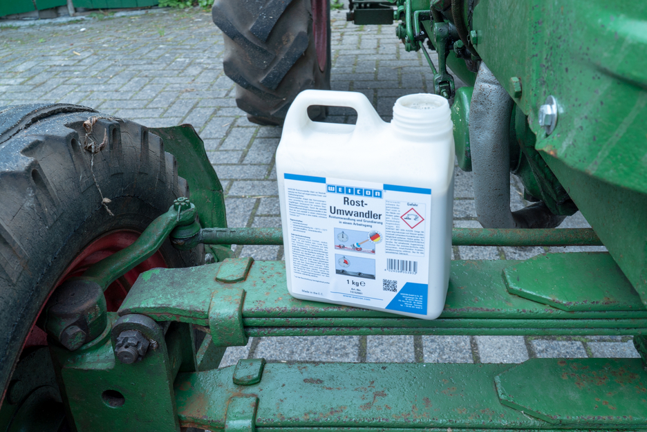 WEICON Rust Converter neutralises rust on corroded iron and steel surfaces and reliably stops corrosion. With its special formula of acid and tannin, the rust converter penetrates the rust. It chemically converts iron oxides into a stable layer and provides temporary corrosion protection through zinc phosphate. Depending on the carbon content of the metal, the treated area changes colour to bluish, brownish or black. The layer provides the perfect base for subsequent protective coatings, e.g. with WEICON Zinc Spray. WEICON Rust Converter achieves optimal results on lightly rusted surfaces with a rust grade of A and B. Loose rust and loose parts should be removed mechanically beforehand. The converter only becomes active when applied to rust or metal and can be used extensively on all rusted areas, such as on machines and equipment, agricultural machinery and motor vehicles. Unlike other converters, WEICON Rust Converter can be washed off the treated surface with clean water and a sponge or soft brush once the reaction time is over. This way, residues that have formed during the conversion process are removed.
