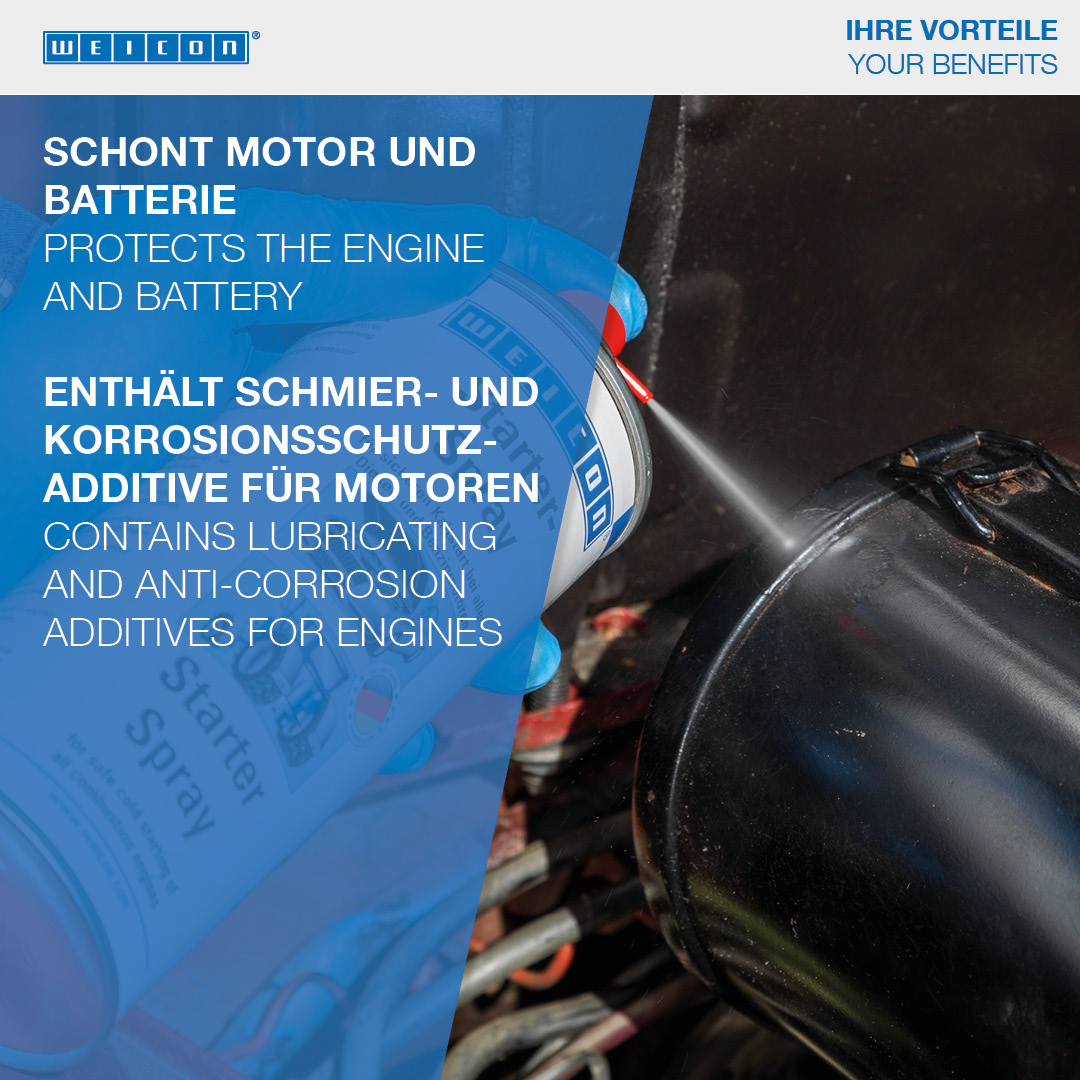 WEICON Starter Spray is suitable for the easy and safe starting of combustion engines. The safe cold starting of all engines is made possible by a special combination of ingredients. Starter Spray is ideal at low temperatures, in damp weather or after longer engine downtimes. That way, it protects both the engine and the battery. WEICON Starter Spray is suited for both diesel and petrol engines. With or without a catalytic converter, whether a motor vehicle, construction machinery, agricultural machinery, chain saws, lawn mowers, boat engines, motorcycles or scooters.