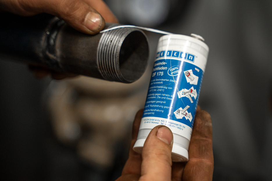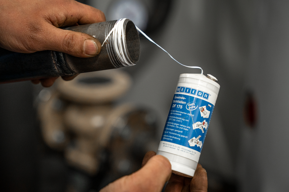 WEICON DF 175 is a patented thread sealing cord made of 100% PTFE that seals almost all metal and plastic threads permanently and safely. WEICON DF 175 reliably compensates the intermediate space on the threads and creates a PTFE film in the required thickness during the screwing procedure. This film is extremely resistant to almost all chemicals, even the most aggressive solvents, caustic agents, and acids. WEICON DF 175 is non-flammable and operates reliably in a temperature range from -200 °C (-328 °F) to +240 °C (+464 °F). In contrast to other sealing materials, for which the fabric solely acts as a base for the actual sealant, WEICON DF 175 itself is the sealing material. A separation of the base material and the sealing material over the service life of the screw connection is thus excluded. Weicon DF 175 is durable for an unlimited period of time and stays permanently soft and elastic. WEICON DF 175 is very economical: One roll replaces up to 20 rolls of PTFE tape (12 mm x 0,1 mm x 12 m).