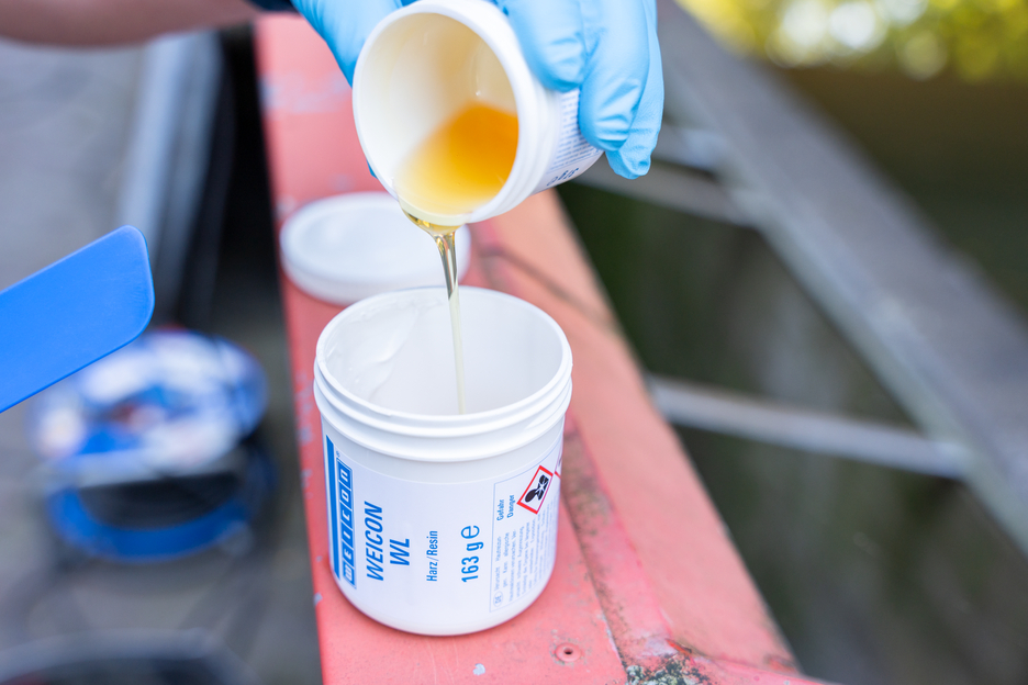 The WEICON WL epoxy resin system is used to coat surfaces that are subject to stresses. It has a high adhesive strength, especially on stainless steel. It is liquid, sprayable, spreadable (can be applied with a brush), self-levelling, retains residual elasticity, is ceramic-filled and chemical-resistant. Owing to its long pot life, WEICON WL can be used for applications with higher ambient temperatures or for larger surfaces. Due to the high flowability of WEICON WL, it is important to ensure a low layer thickness and to observe the layer sequence time. WEICON WL is well suited for a system build-up in combination with other Plastic Metal types. For example, the 2-component epoxy resin can be used as a primer when lining pump casings made of stainless steel that are subject to heavy stress. The surface coating can be used in the field of wastewater technology, on pumps, in water pumping, in mechanical and plant engineering, in apparatus engineering and in many other areas of industry.