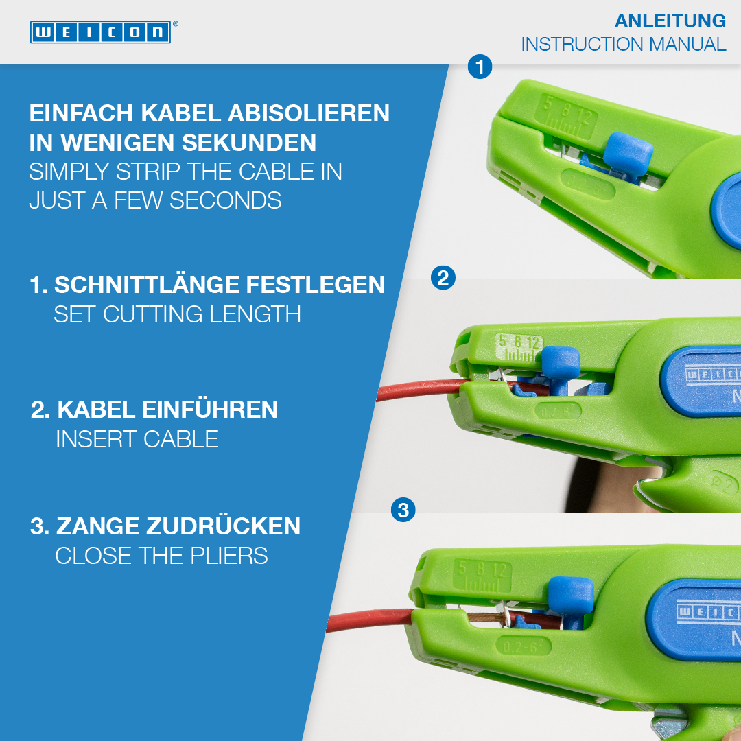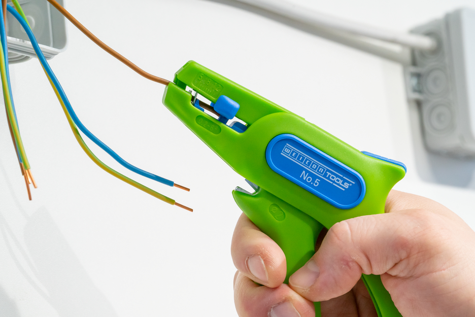 With the Green Line, a very special tool range has been developed. The tools are made of up to 97 % renewable raw materials, which are recyclable and have an excellent life cycle assessment. The WEICON Wire Stripper No. 5 Green Line is suitable for stripping all stranded and solid conductors from 0.2 - 6.0 mm². The wire stripper also has a visual length scale from 5 - 12mm. The length stop can be removed, if required. A well-accessible side cutter is integrated in the tool, which is suitable for cable diameters up to 2 mm. The blades are replaceable. The low weight of the No. 5 ensures fatigue-free working.