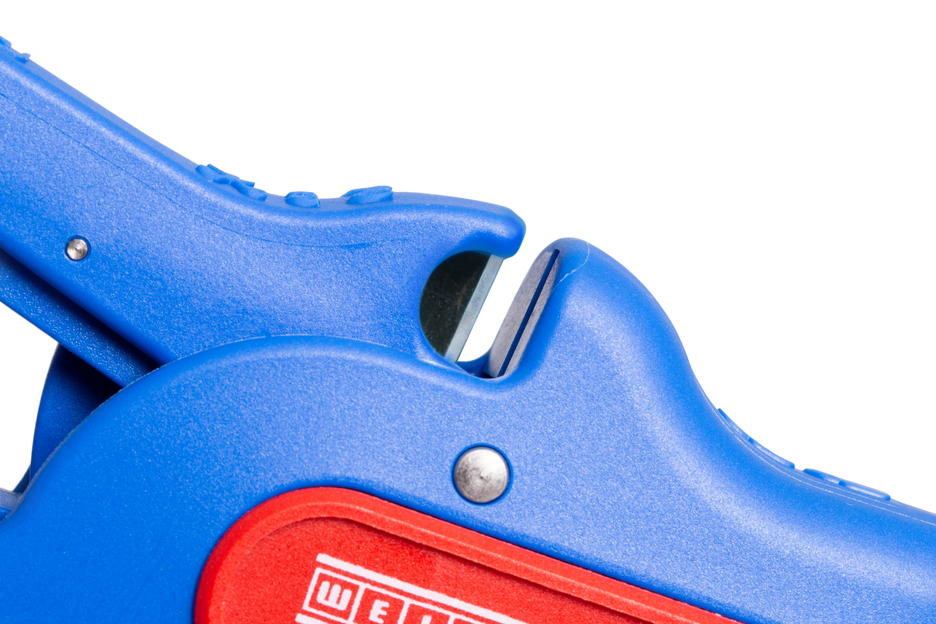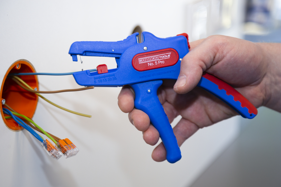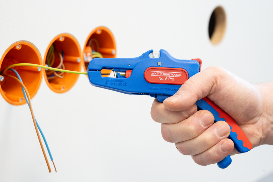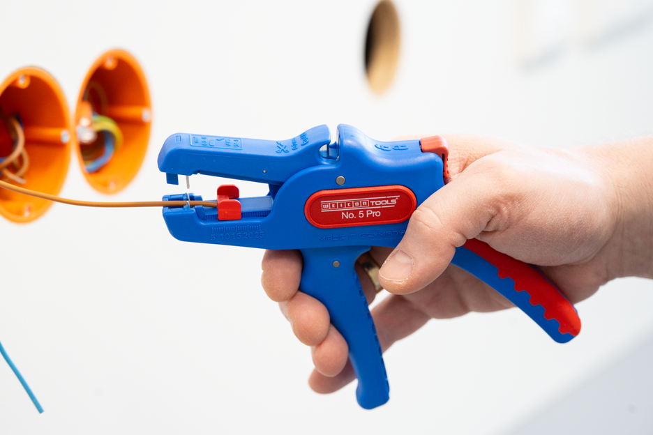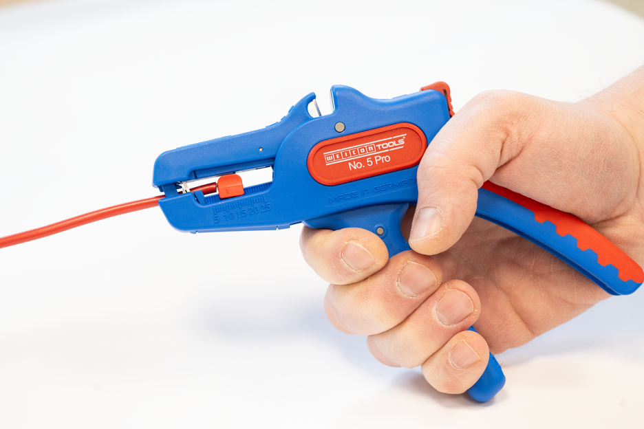 The automatic wire stripper can be used for stripping all common stranded and solid conductors from 0.2 to 16 mm². An adjustable length stop from 5 to 25 mm enables very precise and accurate working. The length stop can be removed, if required. The wire stripper automatically to adjusts to the required conductor cross-section – so no manual adjustment is necessary. The stripping tool features an integrated side cutter, which is suitable for conductors made of copper and aluminium up to a diameter of three millimetres. Thanks to slim design of the tool, the stripper can also be used in working areas that are difficult to access, such as in switch cabinets. The mechanics of the stripping tool are very smooth-running and have proven to be durable and reliable in numerous tests. The wire stripper has a non-slip multi-component handle in the blue-red "Ice Crack" design. The wire stripper has an eyelet to attach a strap for fall protection and is equipped with a labelling surface to be able to individualise the tool. In addition, the tool has a locking mechanism for space-saving storage.