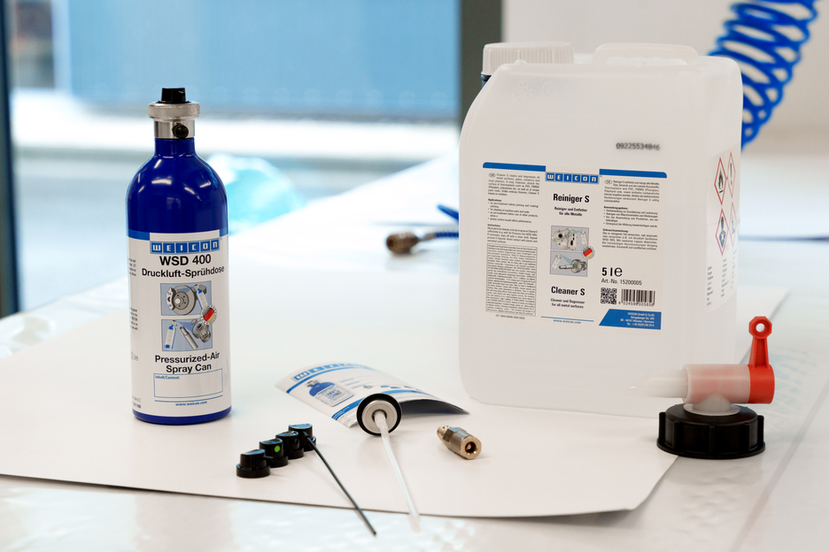 WSD 400 refillable spray can suitable for processing most WEICON Technical Liquids. Filling with compressed air is done by means of an adapter (accessory) via the compressed air network (optimum operating pressure 7.5 bar). The range of accessories for the WSD 400 includes an adapter for filling on any compressed air system as well as a spray set with four different spray heads and a ball valve with suction pipe.